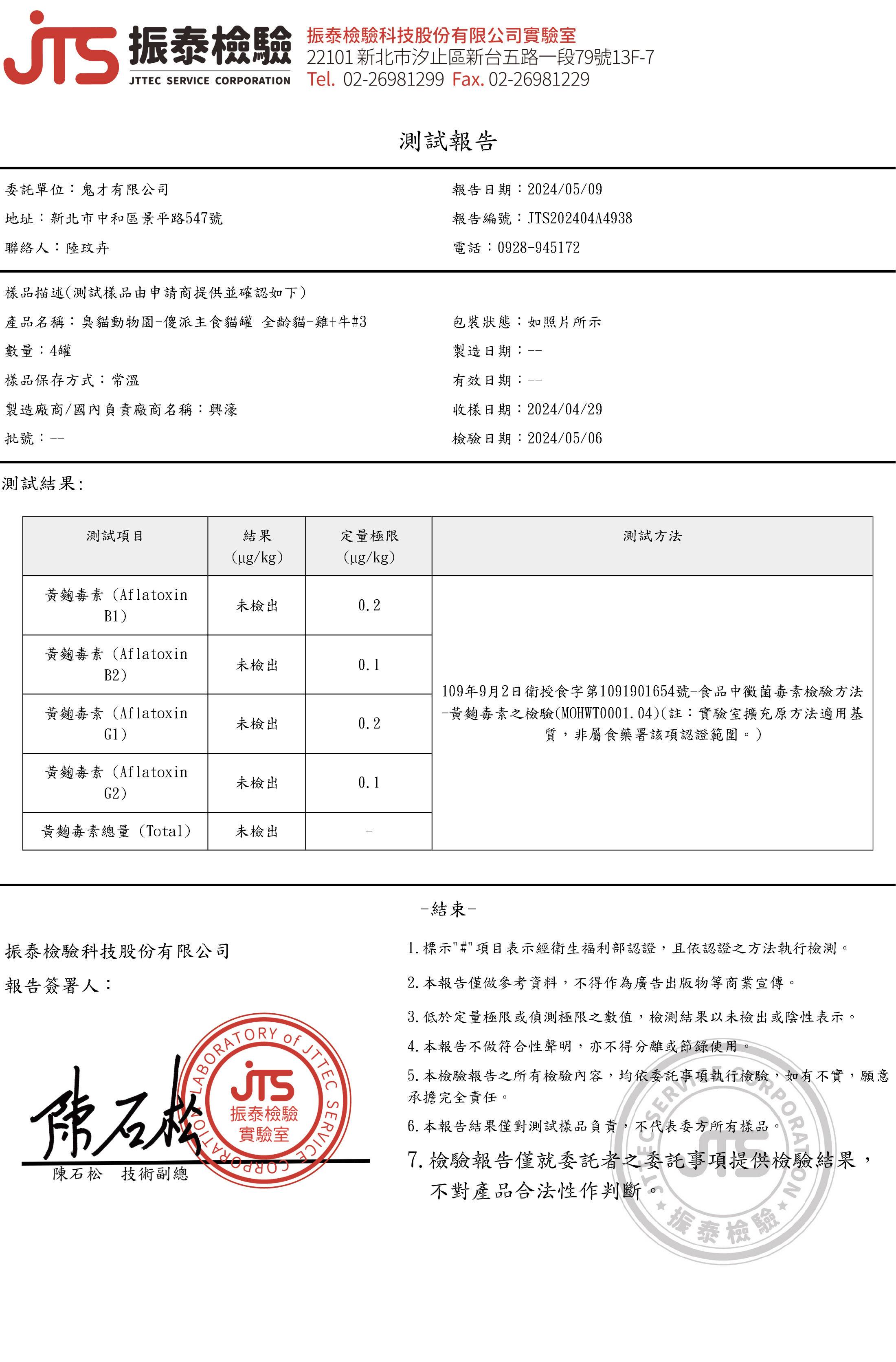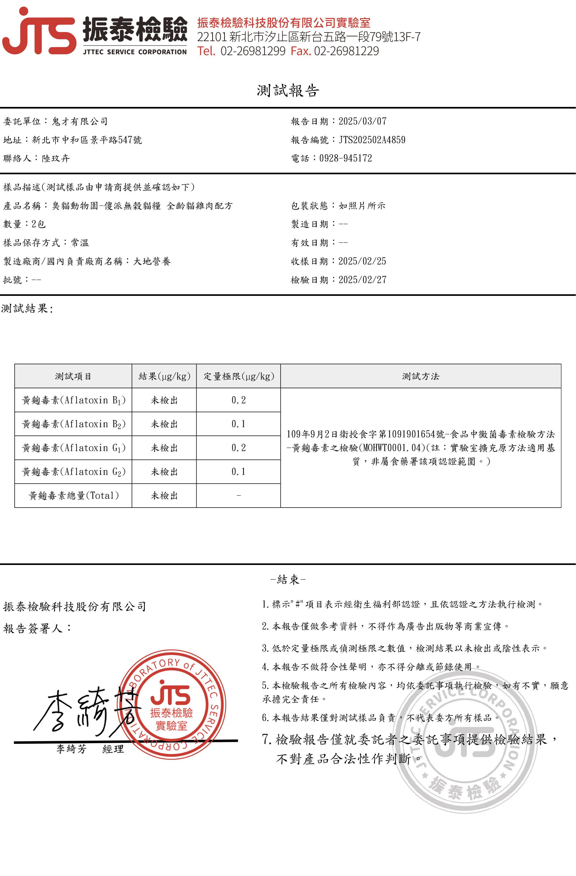 📍 傻派無穀貓飼料:黃麴毒素未檢出