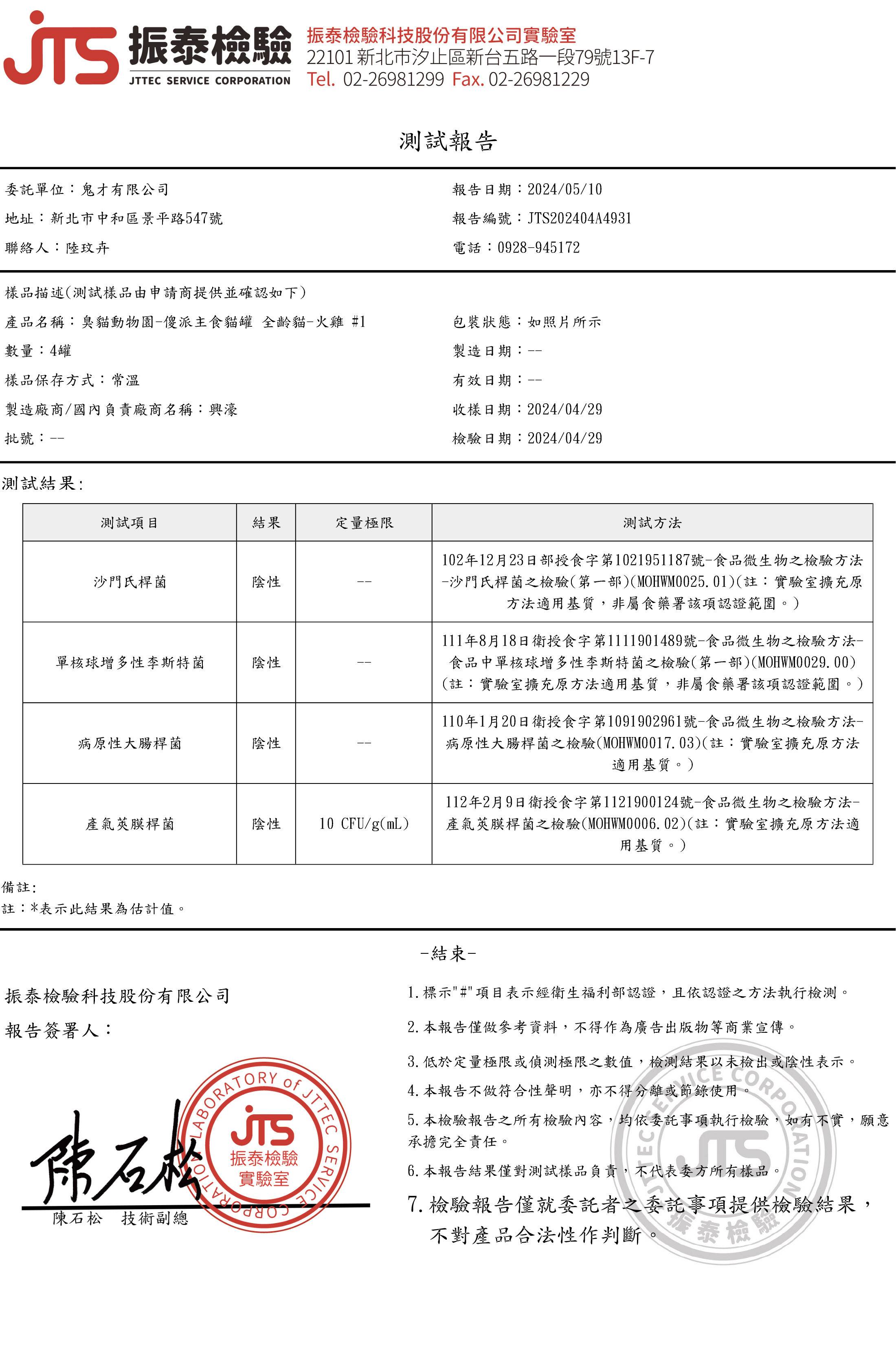 沙門氏桿菌、單核球增多性李斯特菌、病原性大腸桿菌、產氣莢膜桿菌 皆為 陰性。