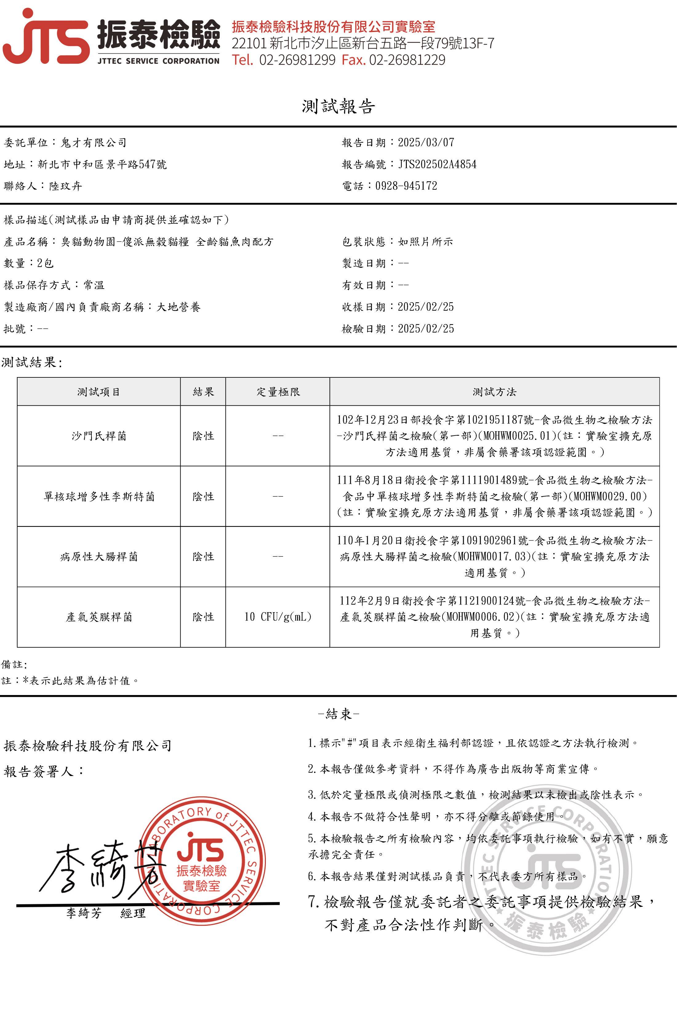 📍 傻派無穀貓飼料:四大致病菌陰性監測