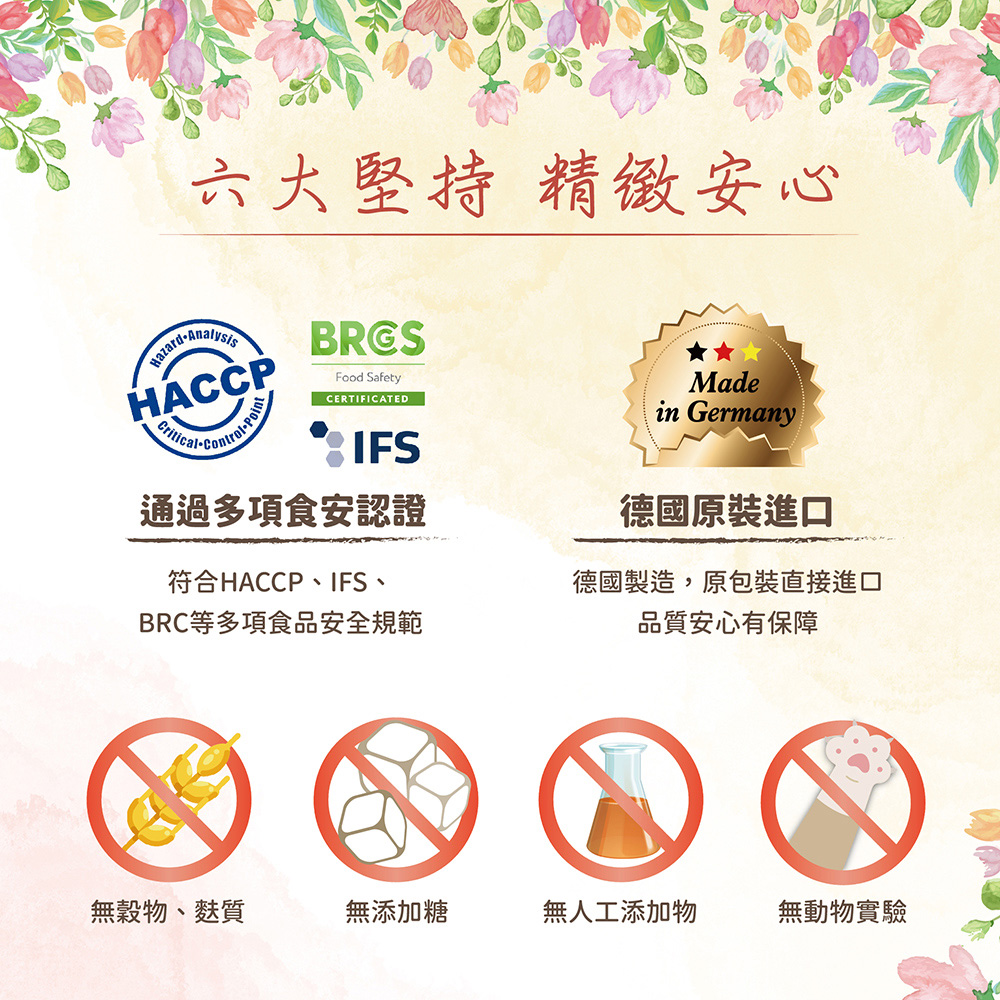 營養添加物(每公斤):維生素 D3 200 IU、牛磺酸 1500 mg、硫酸鋅25 mg、硫酸錳1.4 mg、碘酸鈣0.75 mg、硫酸銅1 mg