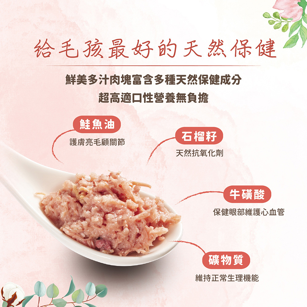主成份:雞肉排50%、雞肉湯37%、雞肝5%、雞脂肪5%、石榴籽1%、鮭魚油1%、礦物質1%