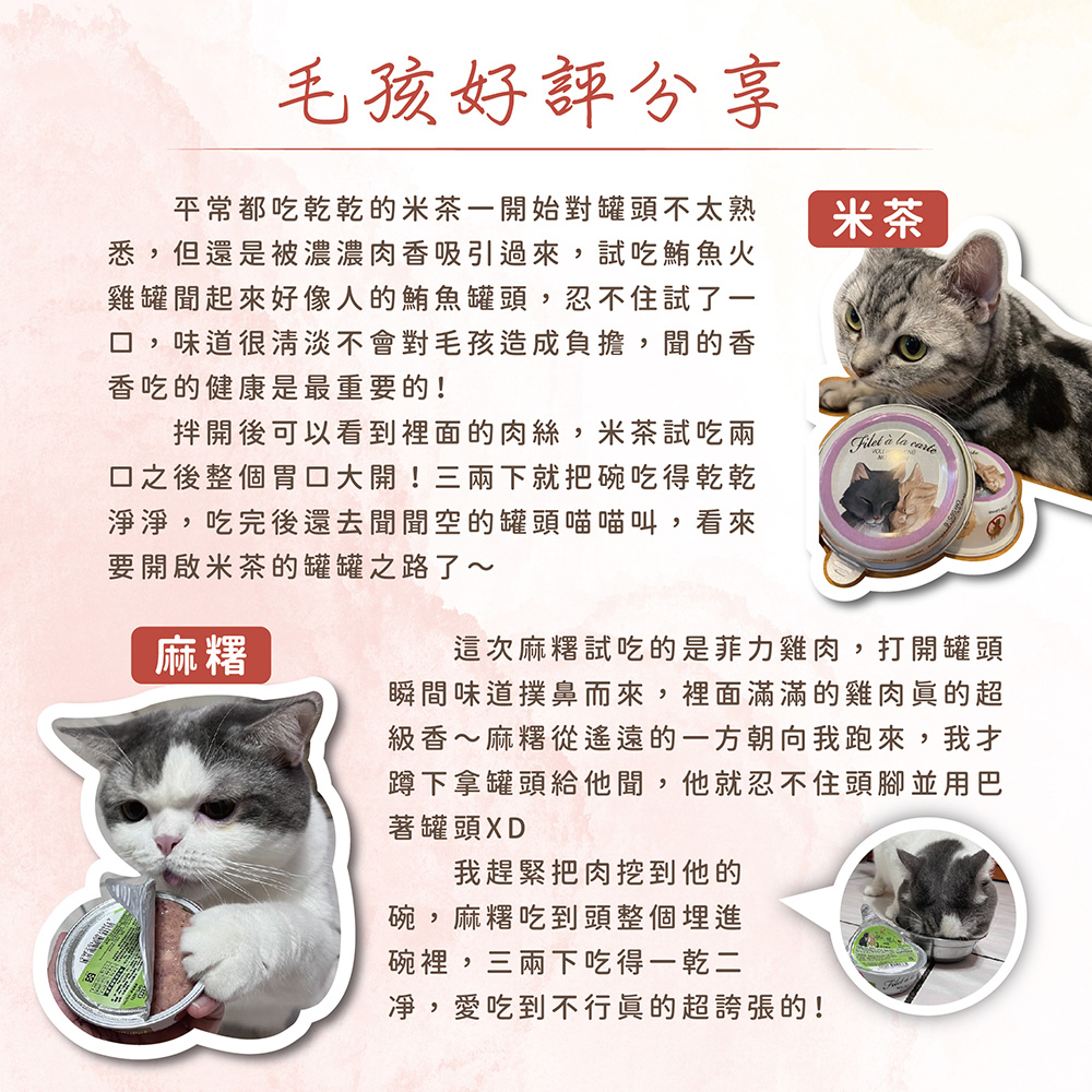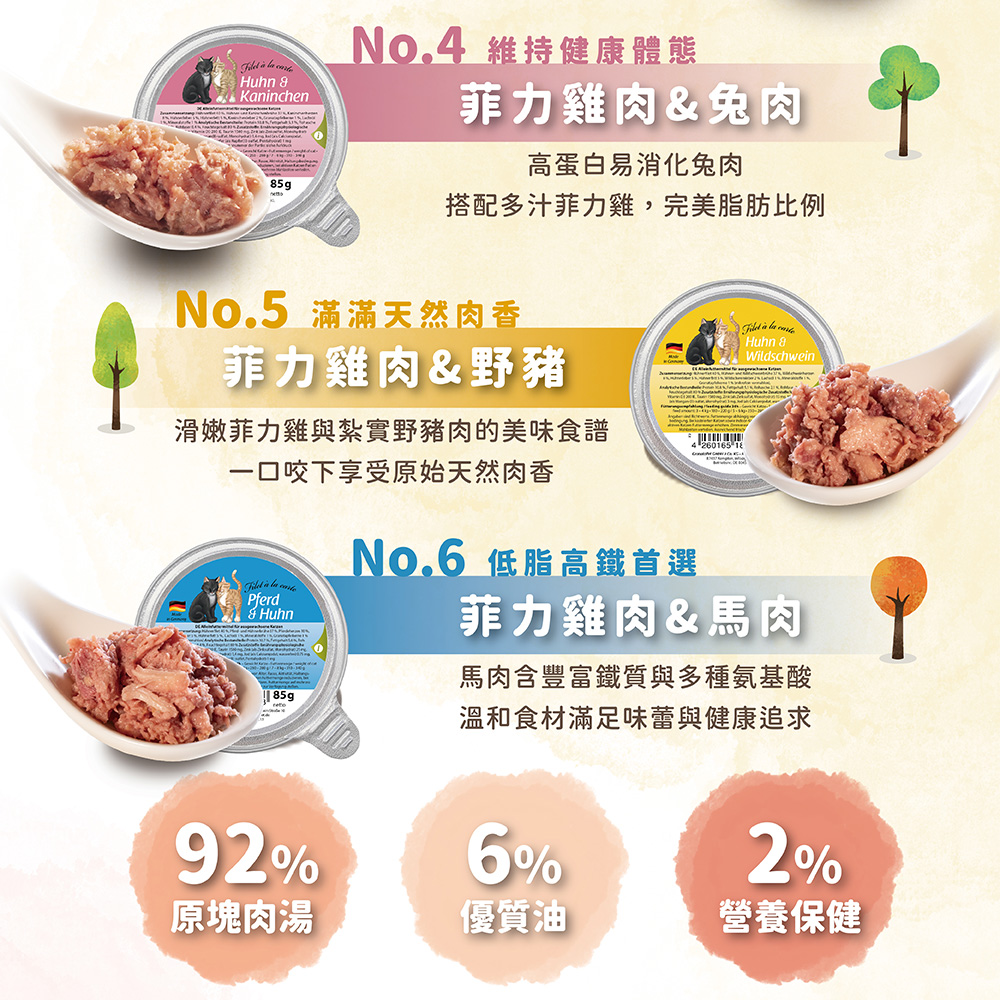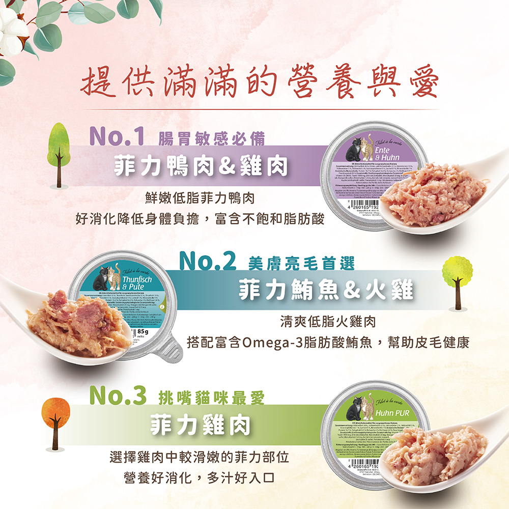 含50%雞肉菲力部位,為肉質部位中無骨、較嫩的一塊,屬於營養好消化的肉類,增添雞肉湯為提供大量水份,讓挑嘴貓補足身體所需水份。