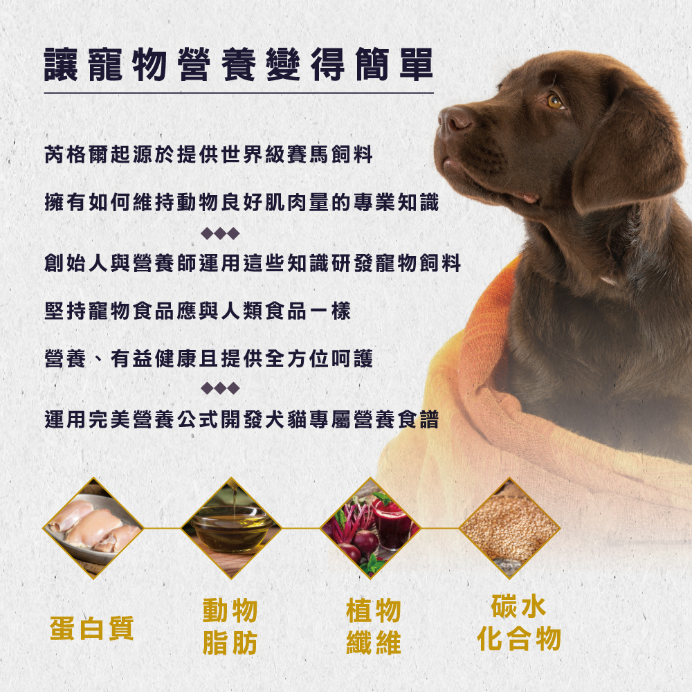 營養分析:粗蛋白(最低)30%、粗脂肪(最低)17%、粗纖維(最高)3.8%、水分(最高)10%、鐵(最低)230 mg/kg、維生素E(最低)136 IU/kg、Omega-3(最低)1%、葡萄糖胺(最低)400 ppm、嗜酸乳桿菌(最低)10 Mil. CFU/lb、鈣1.3%、磷1%、灰分7.4%、鉀0.64%、鈉0.28%、鎂0.11%、鋅244mg/kg、錳63 mg/kg。