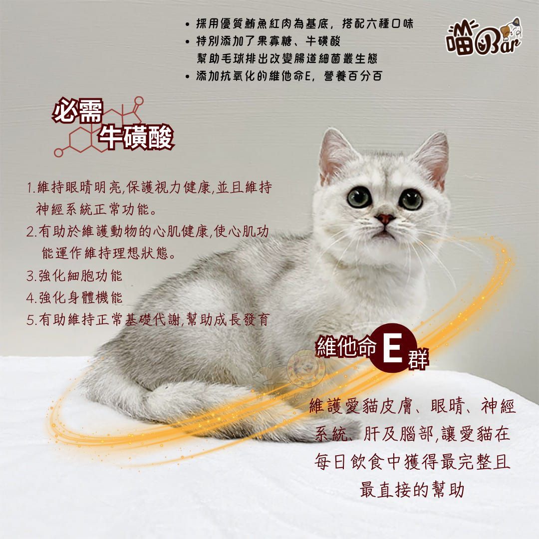 成份:鮪魚紅肉、鮭魚、水、凝膠、果寡糖、維他命E、牛磺酸