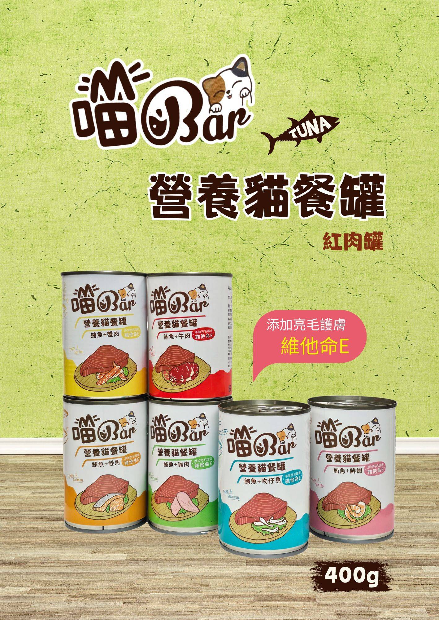 成份:鮪魚紅肉、仿蟹肉、水、凝膠、果寡糖、維他命E、牛磺酸