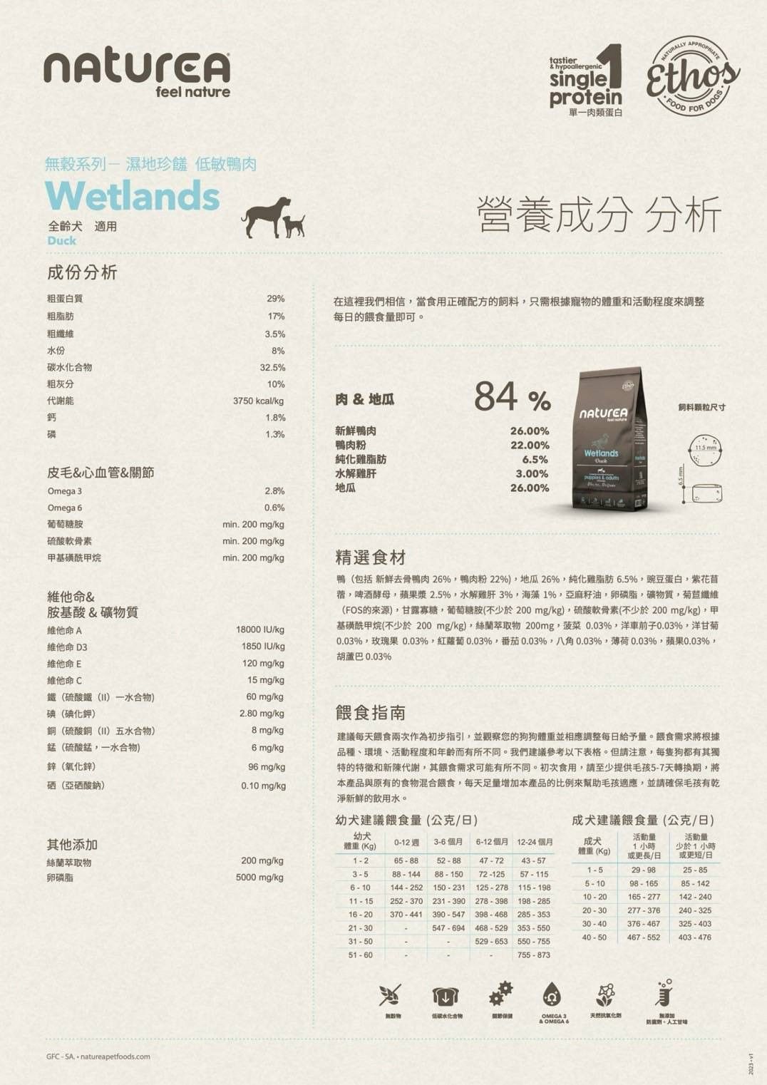 鴨(包括新鮮去骨鴨肉26%、鴨肉粉22%)、甘藷26%、純化雞脂肪6.5%、豌豆蛋白、紫花苜蓿、啤酒酵母、蘋果漿2.5%、水解雞肝3%、海藻1%、亞麻籽油、卵磷脂、礦物質、菊苣纖維(FOS的來源)、甘露寡糖、葡萄糖胺(不少於200mg/kg)、硫酸軟骨素(不少於200mg/kg)、甲基磺酰甲烷(不少於200mg/kg)、絲蘭萃取物200mg、菠菜0.03%、洋車前子0.03%、洋甘菊0.03%、玫瑰果0.03%、紅蘿蔔0.03%、番茄0.03%、八角0.03%、薄荷0.03%、蘋果0.03%、胡蘆巴0.03%