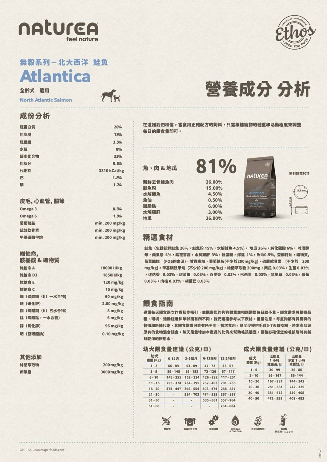 粗蛋白質28%、粗脂肪18%、粗纖維3.5%、粗灰分9.5%、NFE33%、水分8%、0mega-6 2.0%、0mega-3 0.8%、鈣1.8%、磷1.2%、代謝能3810kcal/kg