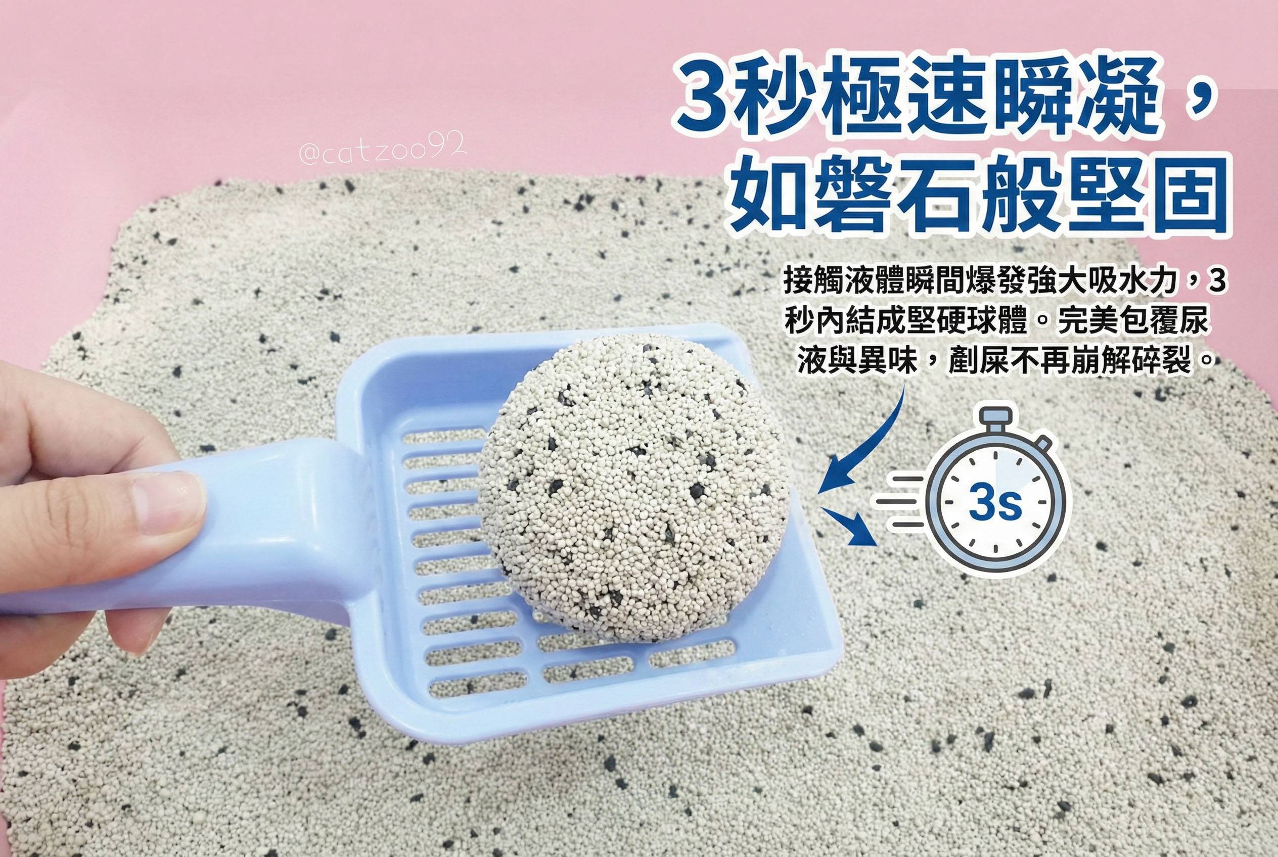 接觸液體瞬間爆發強大吸水力,3秒內結成堅硬球體。完美包覆尿液與異味,剷屎剷尿不易崩解碎裂。