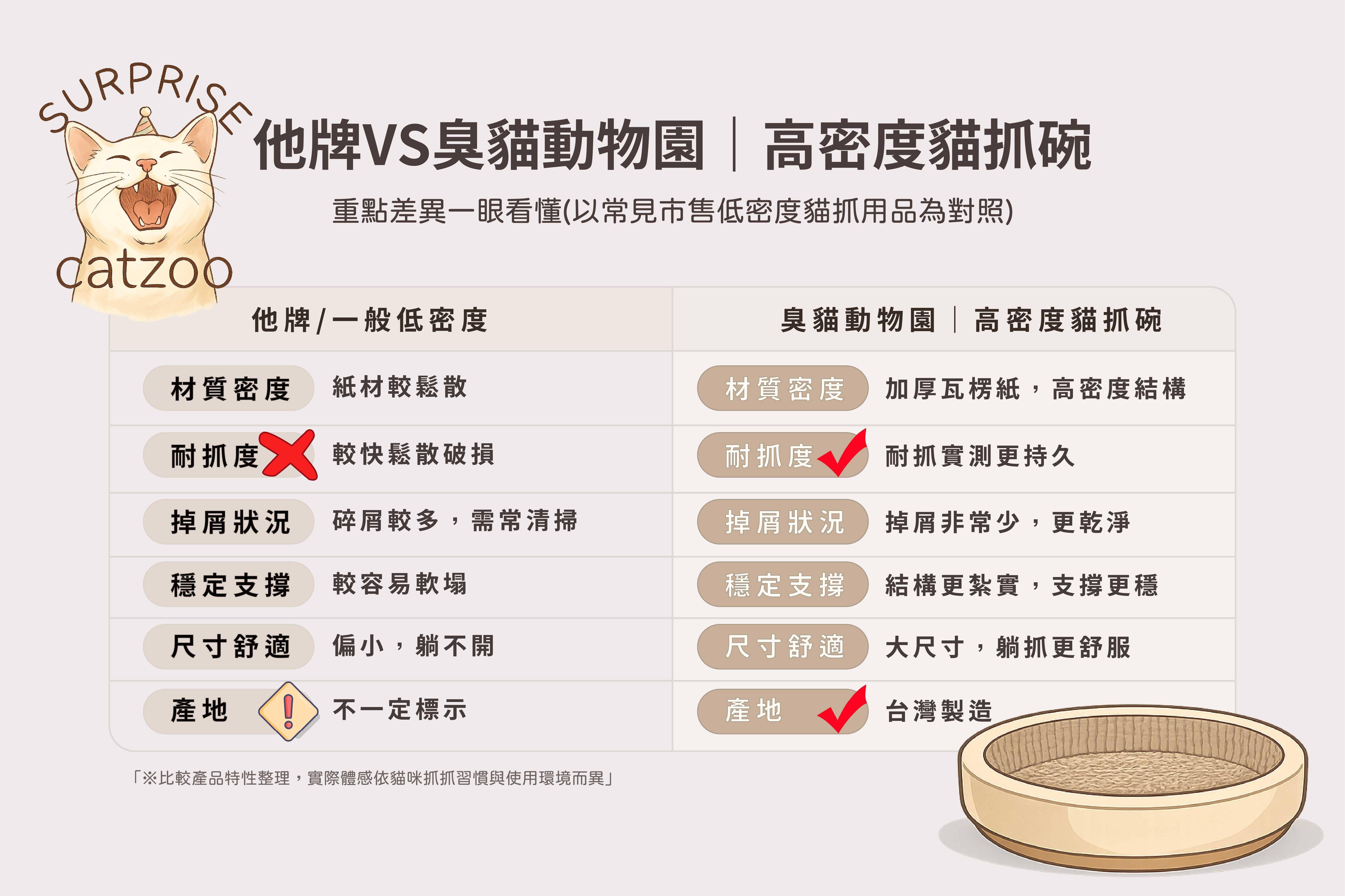 | 比較項目 | 他牌/一般低密度 | 臭貓動物園|高密度貓抓碗 |