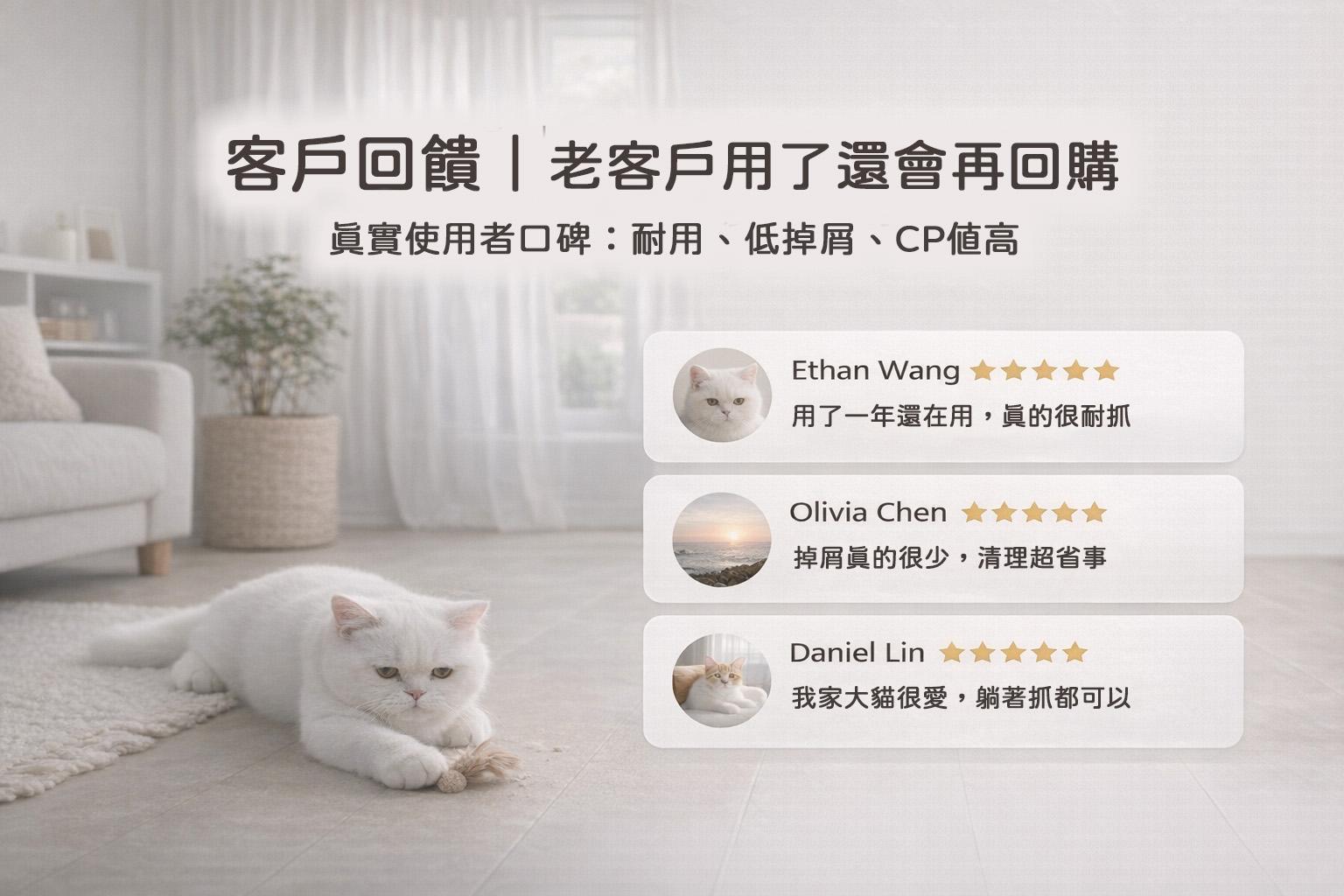 ※ 比較為產品特性整理,實際體感依貓咪抓抓習慣與使用環境而異。